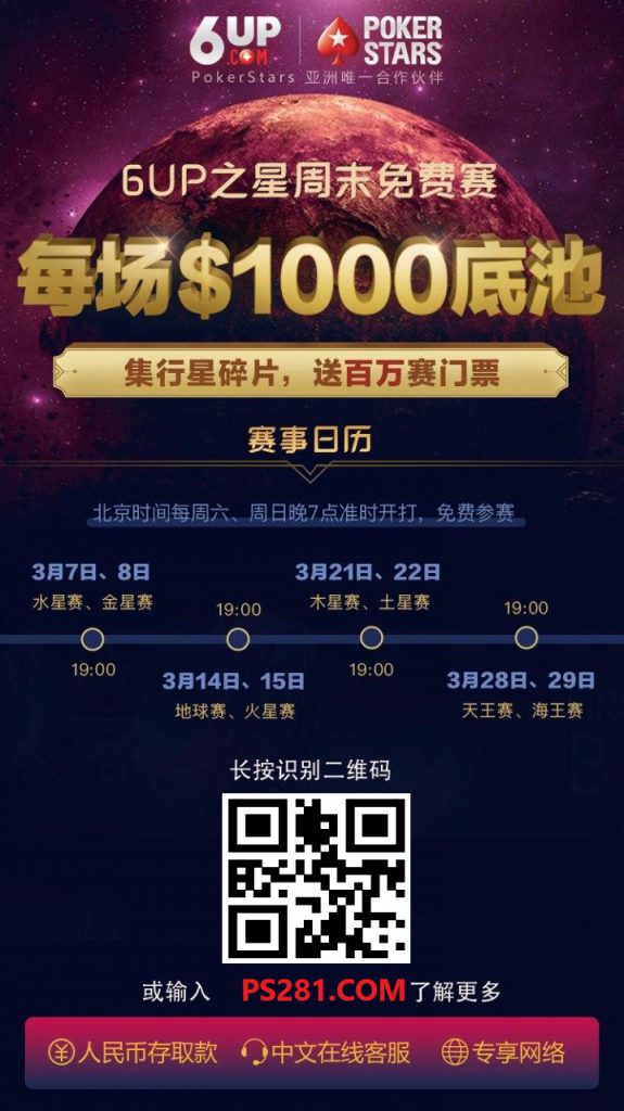 如果喜欢请转载:德州扑克平台 » 【6upoker】6UP扑克之星1000美金周末免费赛