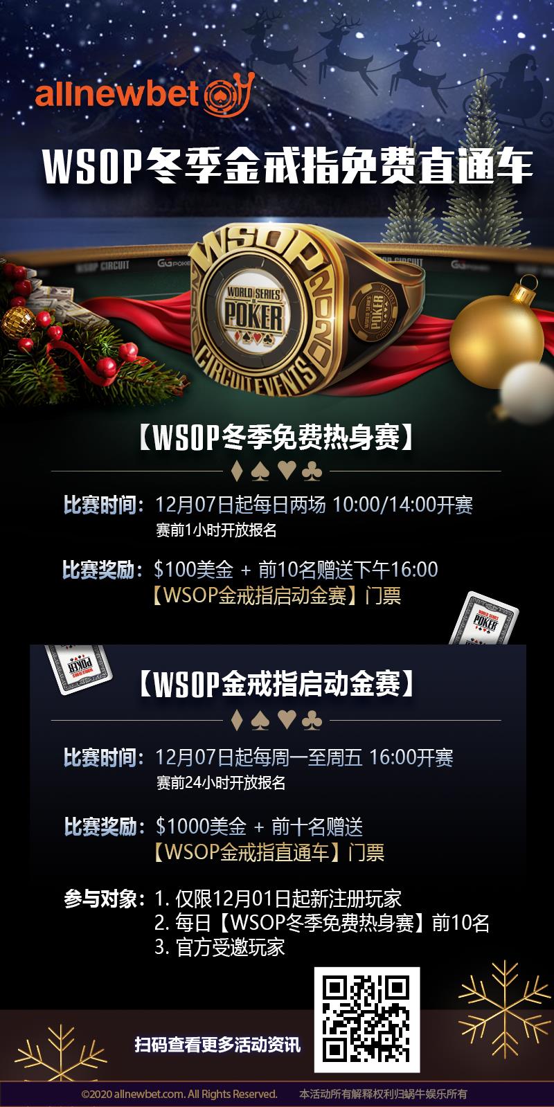 | 12月8日 | 22:00 | WSOP 冬巡赛 #1: BIG $50, $100万美元保底[Day 1] | $50 | $1,000,000 |